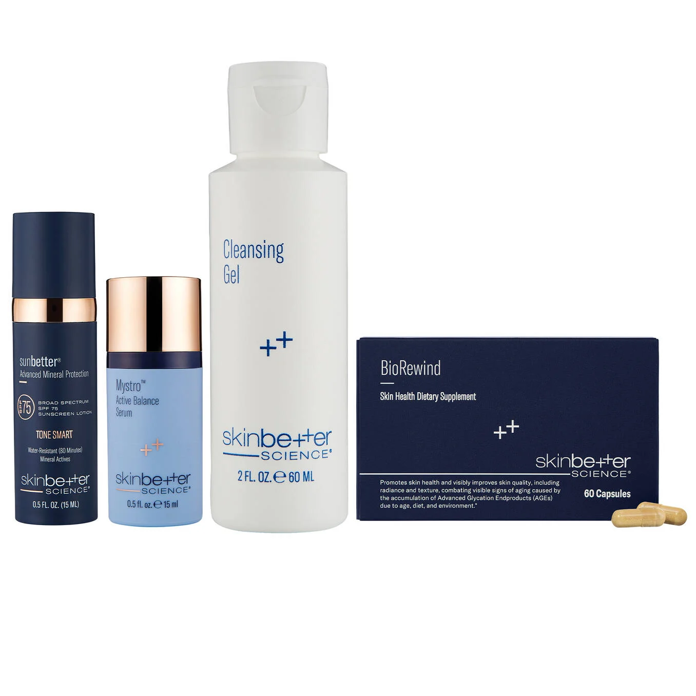 Experience the benefits of balanced, renewed skin from the inside out with our 4 Steps to Balanced Skin Bundle. This gentle yet effective bundle combines CORExtract™ Biotechnology, the holistic power of plant-based adaptogens, broad-spectrum protection, and gentle cleansing agents. Together, these ingredients work to address skin aging signs at its source, helps to combat and prevent sun-damage, and promote overall skin health while leaving skin looking and feeling radiant and revitalized.